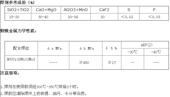 符合: GB/T17854 F308L-H00Cr21Ni10 F316L-H00Cr19Ni12Mo2 F430-H1Cr17 说明::SJ112是氟碱型碱性烧结焊剂,灰白色圆形颗粒,粒度10-60目,碱度2.6,采用硅酸盐、碳酸盐、氟化物、金属氧化物、铁合金等粉剂通过成球、低温烘干和高温烧结等工艺制成。焊剂性能可取代美国林肯的801焊剂,焊缝成型美观,表面光滑,无夹渣气孔裂纹,焊接工艺良好。 用途::可用于低合金钢焊接,与Cr13系、224H、225管状焊丝、实心焊丝配合堆焊使用,具有优良的高温脱渣性能。 该焊剂适于直流反接,广泛应用于连铸机滚、冷轧辊、支承辊、热工作辊等的焊接。堆焊层具有较好抗高温氧化性和抗磨损、抗热疲劳综合性能。